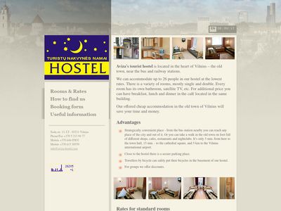 Tekstinė tinklalapio versija: Aviza’s tourist hostel Advantages is located in the heart of Vilnius – the old town, near the bus and railway stations. Rates for standard rooms We can accommodate up to 26 people in our hostel at the lowest rates. There is a variety of rooms, mostly single and double. Every room has its own bathroom, satellite TV, etc. For additional price you can have breakfast, lunch and dinner in the café located in the same building. Our offered cheap accommodation in the old town of Vilnius will save your time and money.   [..]
