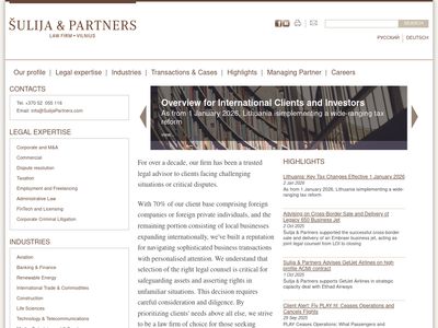 Email: info@SulijaPartners.com Legal expertise International Recognition Šulija Partners Law Firm Vilnius is a commercial law firm based in the capital of Lithuania. Our practice encompasses all aspects of business and corporate law. We represent businesses and individuals in high-profile commercial, tax, administrative and employment litigation and advise clients on challenging legal issues. Industries Case Law of the European Court of Justice In particular, our law firm has a strong international focus. We have experience assisting in cross-border litigation, and international commercial transactions, including providing expert evidence on Lithuanian law for use in foreign proceedings. International Clients Annual Conference – Forum on Contract Law We are chosen by the clients who already know the Lithuanian market, but they are still looking for prompt problem solving, partner relationship, and [..]